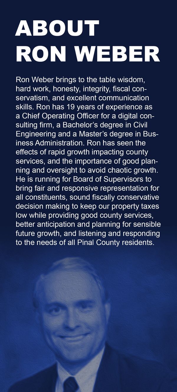 Mr. Weber is honored to be a candidate for Pinal County Board of Supervisors District 1. He resides in an unincorporated area in Pinal County (in the San Tan Mountains) with his wife of 30 years, and has a son and an adult daughter as well. He has a bachelor’s degree in Civil Engineering and a Master’s degree in Business Administration. He has served for the last 20 years as the Chief Operating Officer of Trinet Internet Solutions, Inc., a digital consulting firm with corporate, non-profit, and faith-based clients. He is a firm believer of faith, family and freedom. He is a regular church attender, leads a weekly Christian businessmen’s connection chapter, attends weekly bible studies, and enjoys meeting and praying for his neighbors. Mr. Weber relies upon the Holy Bible and the Constitution of the United States of America, and believes it is important to be self-reliant and always be prepared to help others, so that he might be a blessing to his neighbors.